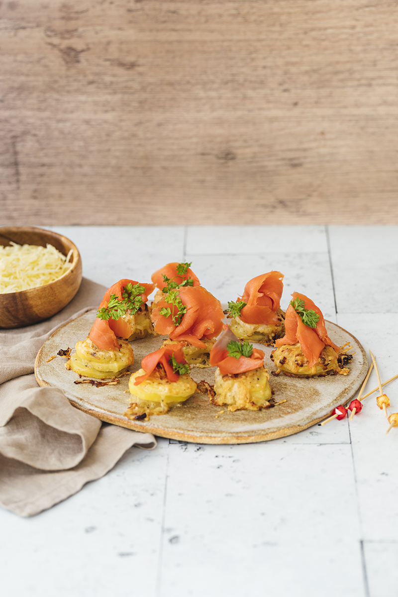 Millefeuille de pommes de terre, saumon fumé et Emmental Français râpé Entremont