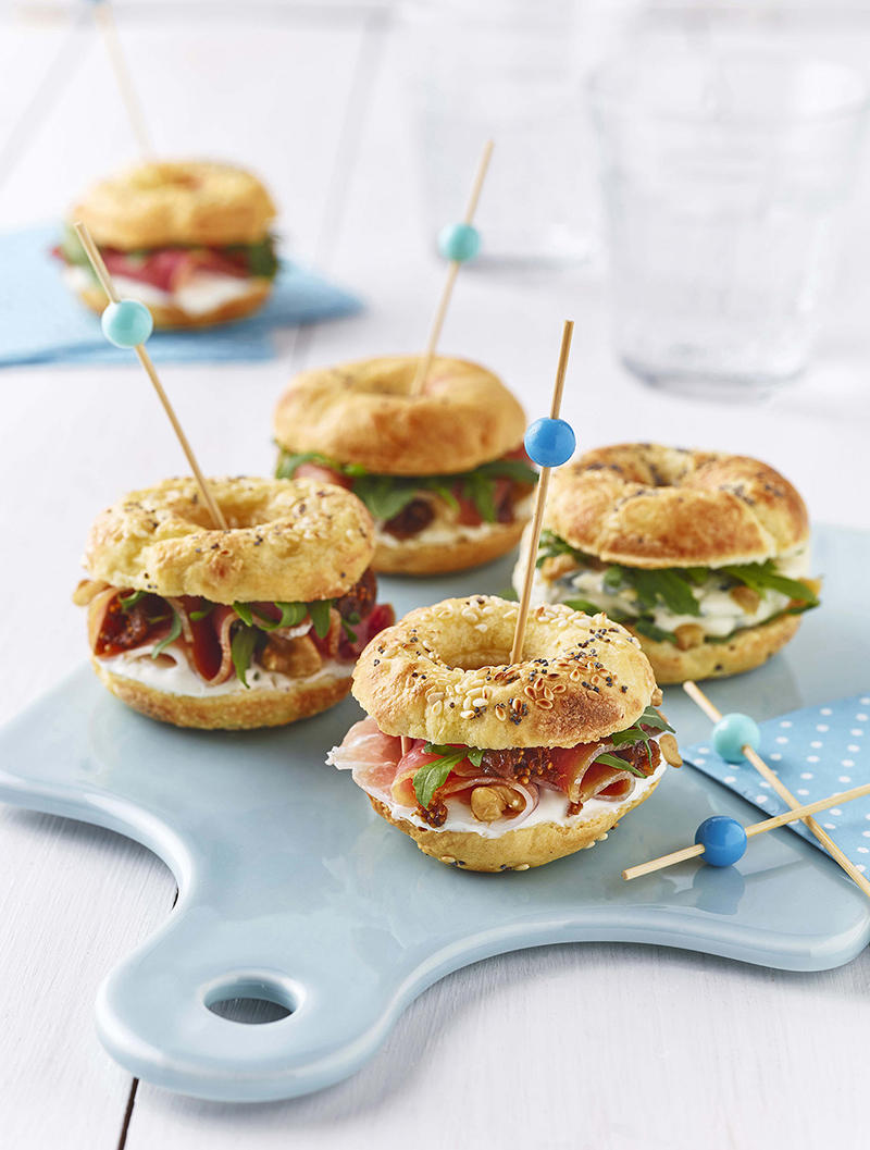 Réalisez le montage de vos bagels, en parsemant un peu de noix hachées, puis en ajoutant du jambon cru, des tranches de figues fraiches et de la roquette.