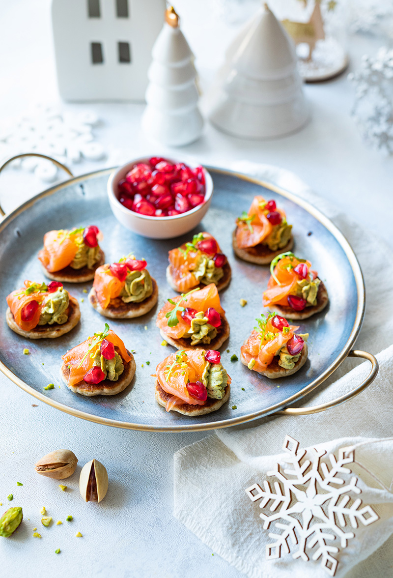 Mini blinis à la crème de pistache, saumon fumé & grenade
