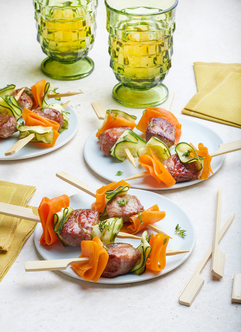Ces mini-brochettes de gigot d’agneau aux légumes croquants seront parfaites pour un repas convivial, sous le soleil.