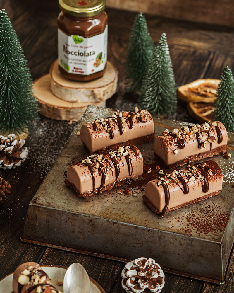 Sur chaque bûche, saupoudrer un peu de cacao, verser un filet de Nocciolata Sans Lait et déposer des noisettes.