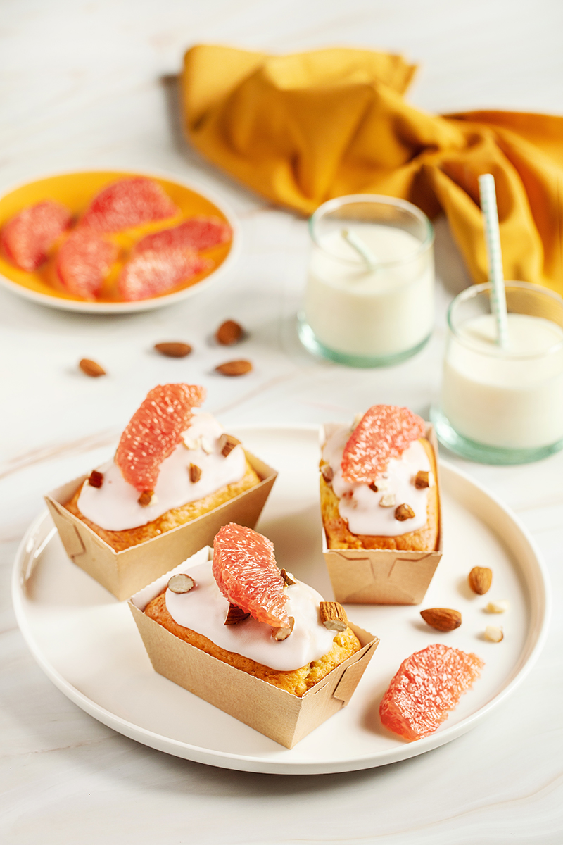 ⑥• Préparer le glaçage en mélangeant le jus de pamplemousse de Floride et le sucre glace. Recouvrir le dessus des cakes avec ce glaçage.