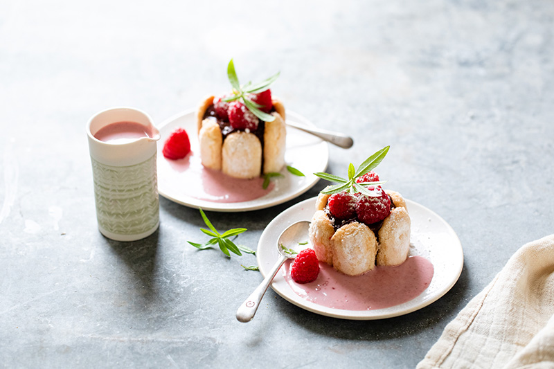 Mini charlottes à la mousse au chocolat, coulis de framboises à la crème anglaise