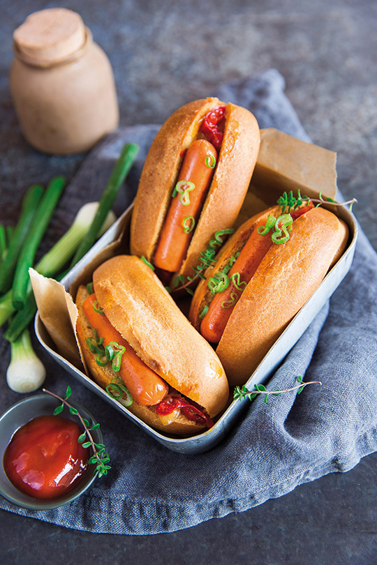 ③• Dresser les hot-dog avec une cuillère à café de compotée de poivrons puis les Knacks Veggie Nature Tartex. Terminer en badigeonnant de moutarde, quelques oignons frits et de l’oignon cébette ciselé.