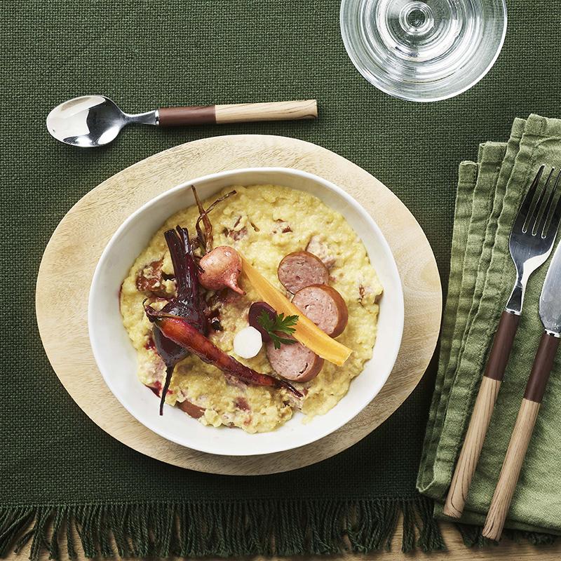 Mini-légumes glacés au cassis de Bourgogne, polenta crémeuse et Saucisse de Montbéliard
