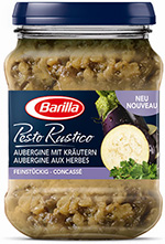 Le Pesto Rustico Aubergine aux Herbes Barilla propose un goût unique grâce à la présence de généreux morceaux de légumes mûris et dorés par le soleil de la Méditerranée.