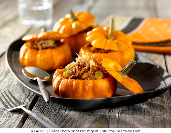 Au moment de servir, poser les chapeaux appuyés sur le côté des potirons, pour l’esthétique !