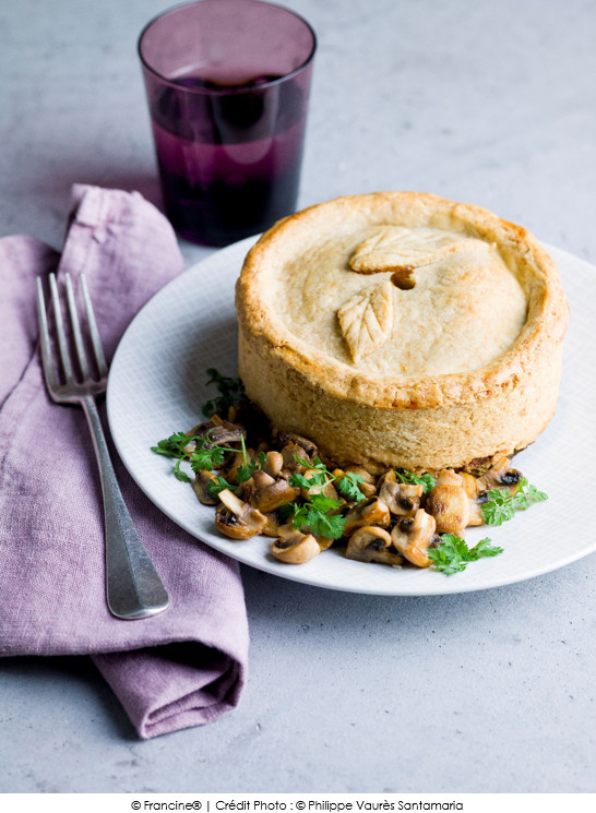 Garnir les moules du mélange, poser les chapeaux et ourler la pâte de façon à fermer la tourte. En percer le dessus pour laisser la vapeur s’échapper. Dorer au lait à l’aide d’un pinceau et enfourner pendant 30 à 35 mn.