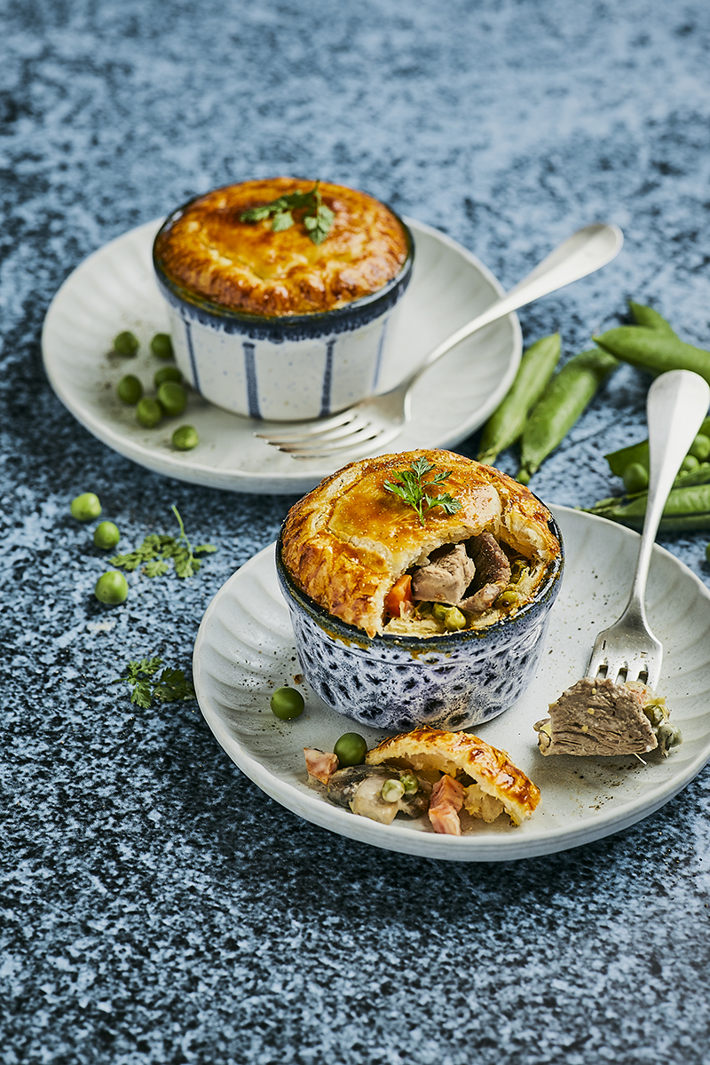 ④• Découper 12 cercles de pâte feuilletée et abaisser la moitié dans 6 ramequins. Répartir ensuite la préparation à l’agneau et recouvrir d’un disque de pâte. Souder bien les bords et découper l’excédent si nécessaire. Battre le jaune d’œuf dans un petit récipient et badigeonner chaque tourte au pinceau. Enfourner pour 25 min de cuisson.