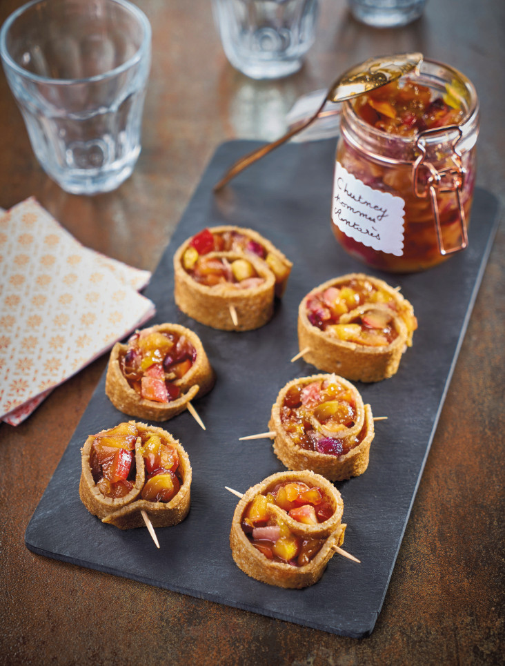 Mini wraps sarrasin, chutney de pommes Antarès®, oignons rouges, cranberries et lanières de bacon