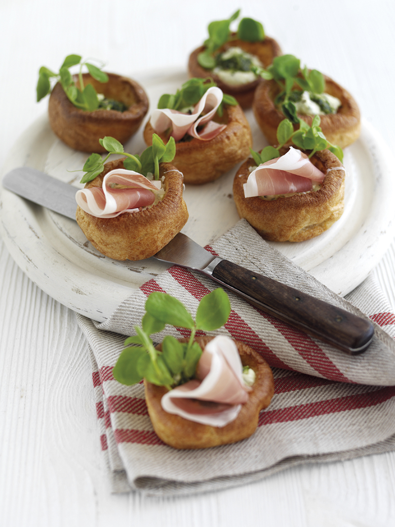 Mini Yorkshire Puddings fourrés au Jambon de Parme, Philadelphia et sauce pistou
