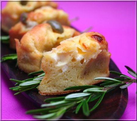 3- Verser à l’intérieur des moules de la pâte à cake et déposer des olives vertes dénoyautées et 4 portions de La vache qui rit coupées en dés dessus.
