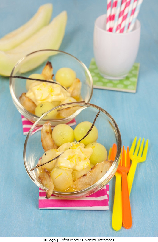 ①• Réaliser des billes de melon à l’aide d’une cuillère à melon. Verser dessus Pago Melon Fruits Du Soleil, préalablement tiédit dans une casserole. Laisser refroidir, afin que le melon prenne la saveur du jus. Réserver.
