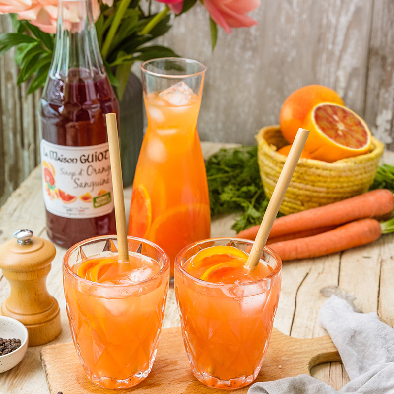 Dans cette recette, le nouveau sirop d’Orange Sanguine de la Maison Guiot et le jus de carotte s’associent pour un résultat frais et acidulé, le tout subtilement relevé par un soupçon de gingembre et une touche de poivre.