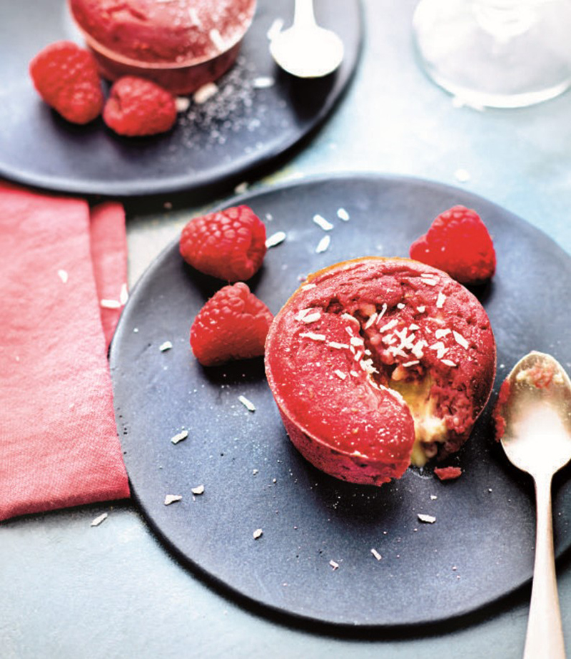 Astuce : entourez les moelleux d’un petit cordon de coulis réalisé avec 200 g de framboises mixées puis tamisées et 1 cuillerée à café de jus de citron.