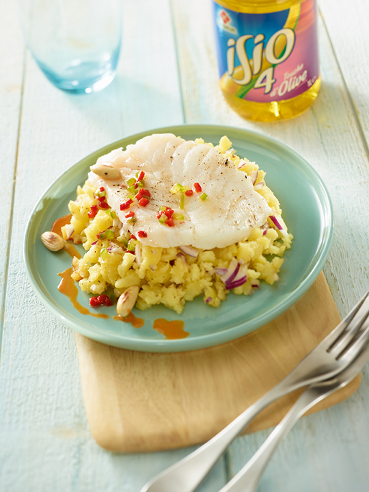 ⑤• À l’aide de la pointe d’un couteau, contrôlez la cuisson des pommes de terre. Une fois cuites, égouttez-les et déposez-les dans un saladier. Écrasez l’ensemble à la fourchette, ajoutez l’oignon rouge et l’oignon nouveau finement ciselés et un généreux filet d’huile ISIO 4 Touche d’olive et rectifiez l’assaisonnement si besoin. Réservez au chaud.