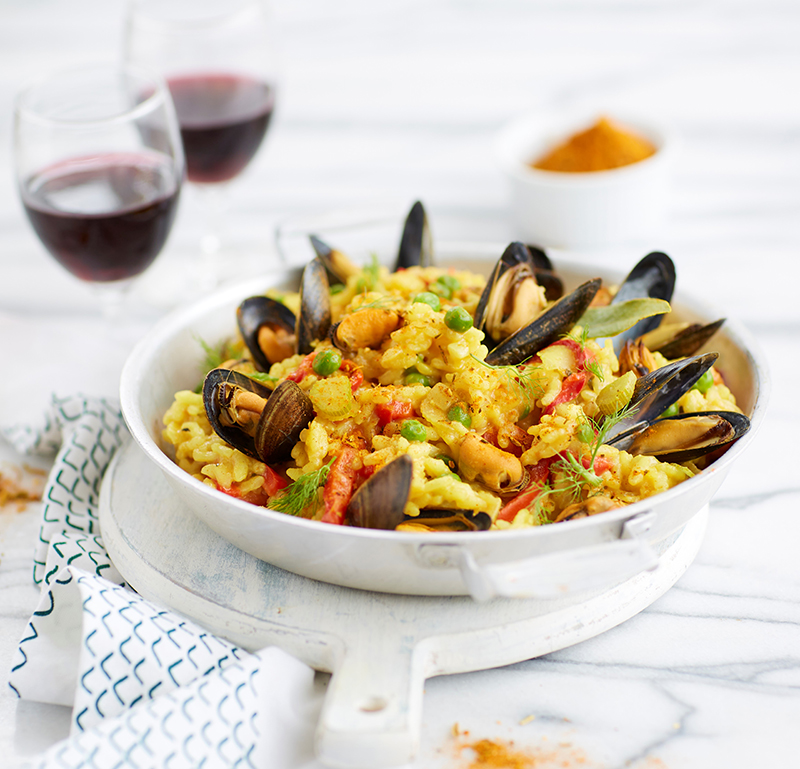 Réservez 20 moules en coquilles pour le dressage et décortiquez le reste. Réservez le jus de cuisson des moules pour le riz.