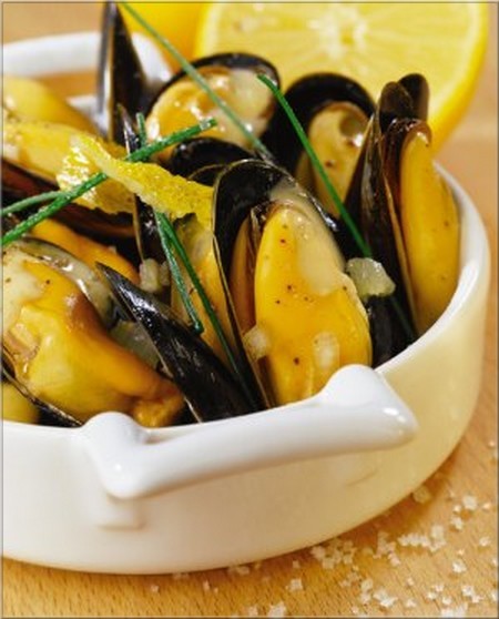 Servez aussitôt les moules dans des assiettes creuses en les nappant de sauce au citron. Décorez avec quelques brins de ciboulette et les dés de citron.