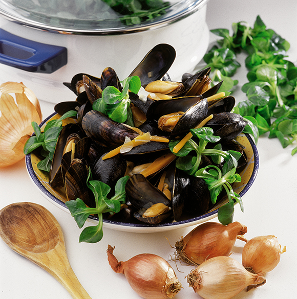 ⑥• Faire fondre le beurre dans un faitout, y faire suer l'oignon et les échalotes pendant 3 minutes. Ajouter la carotte et le céleri. Cuire 2 à 3 minutes, puis les champignons. Cuire de nouveau 4 à 5 minutes. Arroser de vin, ajouter les moules. Poivrer. Couvrir et cuire à feu doux jusqu'à ce qu'elles s'ouvrent en les mélangeant régulièrement. Les débarrasser dans un saladier couvertes d'un papier aluminium. Faire réduire le jus de cuisson de moitié, ajouter la crème fraîche. Faire réduire de nouveau jusqu'à l'obtention d'une consistance onctueuse. Ajouter les moules. Les mélanger de manière à les enrober de sauce et parsemer d'herbes.