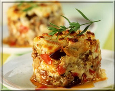 16.Incorporez 1 œuf à la préparation de viande. Répartissez la moitié des aubergines dans le ou les moules, couvrez de viande hachée puis du reste des aubergines puis versez la sauce.