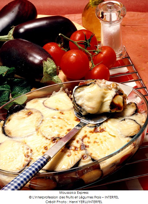 4• Garnir un plat à gratin de couches successives de tranches d'aubergines et de farce d'agneau. Terminer par une couche d'aubergine. Couvrir de Béchamel.