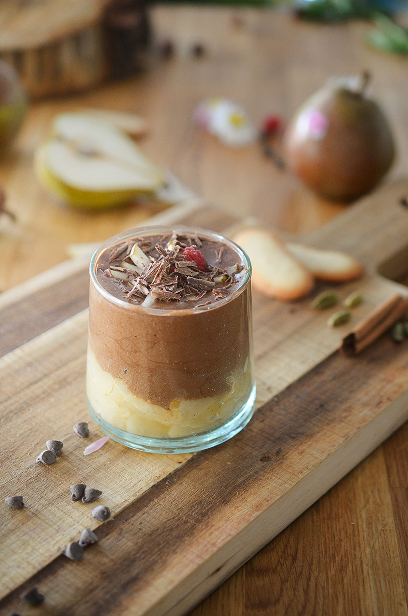 ⑦• Dans vos verrines, répartissez votre compotée de poires. Ajoutez sur le dessus la mousse au chocolat et laissez reposer au frais au moins 2 heures.