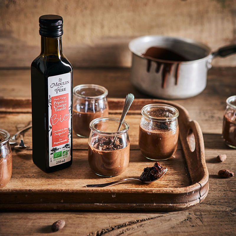 Mousse au chocolat gourmande à l’huile de pépin de courge toasté