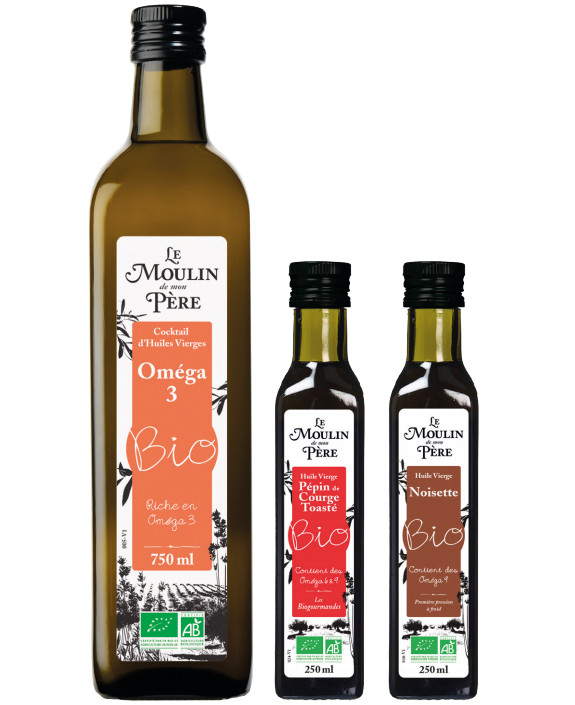 Spécialiste des huiles végétales biologiques, Le Moulin de mon Père propose toute une gamme de références bio conditionnées en Provence, grâce à un savoir-faire artisanal hérité de plusieurs générations de mouliniers. Au nombre de 20, les huiles Le Moulin de mon Père révèlent un goût authentique ainsi que tous les bienfaits naturellement présents dans la graine ou le fruit.