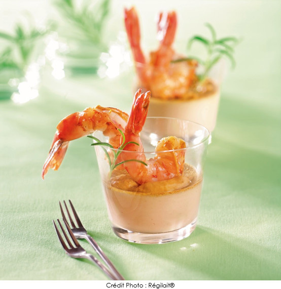②• Décortiquer les gambas. Sauter les têtes et la carapace à l’huile d’olive, ajouter les carottes et les oignons, le vin blanc et le concentré de tomates. Recouvrir d’eau et laisser cuire 15 minutes à feu moyen. Verser le lait en poudre Régilait et recuire 5 minutes. Mixer le tout, tamiser et rectifier l’assaisonnement en sel et poivre.