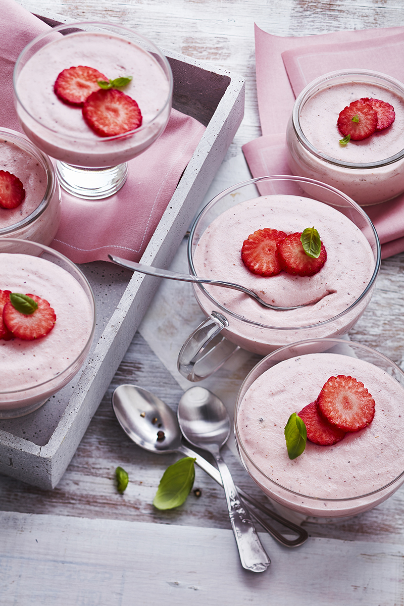 Décorer les mousses de morceaux de fraises et de basilic frais juste avant de servir.