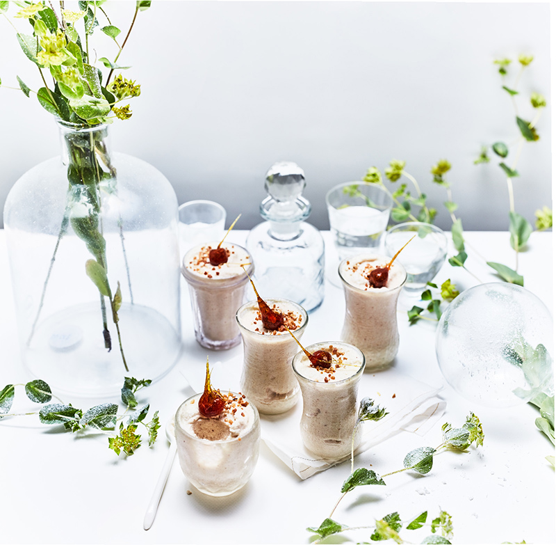 ⑤• Au moment de servir, parsemez chaque ramequin de pralin et décorez avec les noisettes caramélisées.