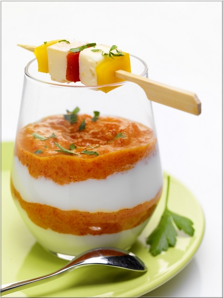 5• Remplissez des verrines en alternant le mélange au Reblochon et le coulis de poivrons.
