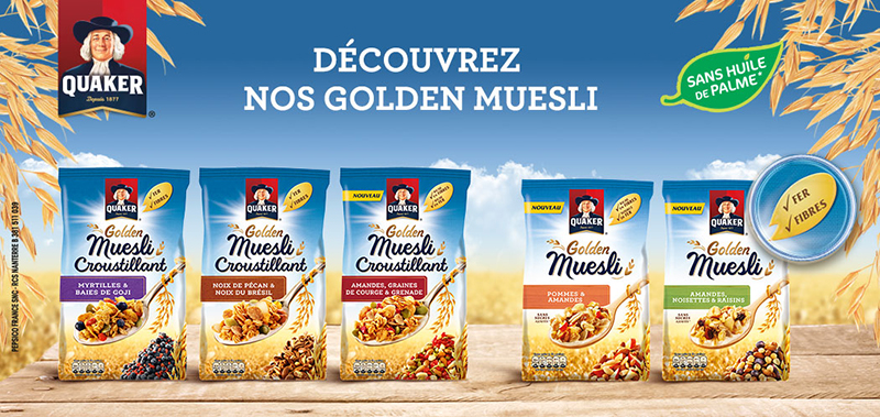 Du bien-être avec Golden : En 2016, Quaker lance la gamme Golden : des céréales alliées à de savoureux ingrédients, comme les noix ou les baies de Goji, et 30% moins sucrées que la moyenne des céréales de petit-déjeuner pour adultes, pour offrir toujours plus de bien-être à ceux qui aiment prendre soin d’eux !