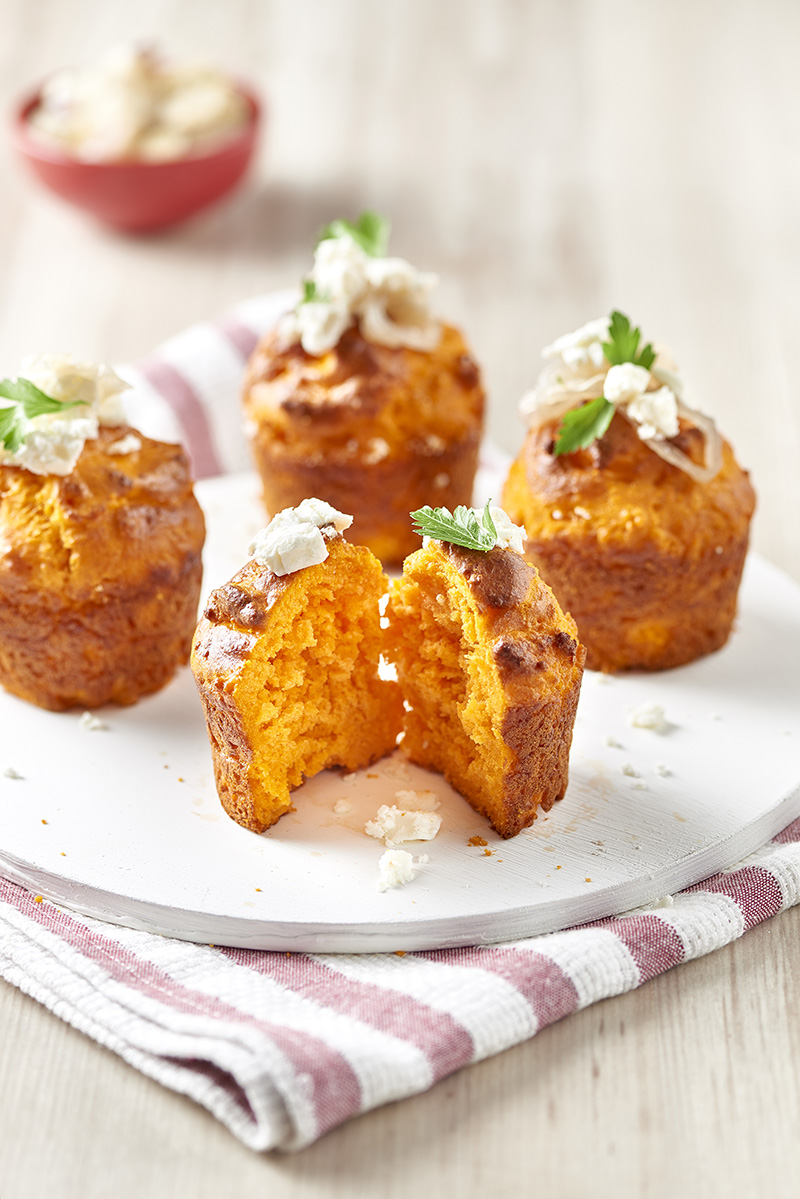 ⑥• Démouler les muffins, disposer un peu d’oignon caramélisé et saupoudrer de féta émiettée.