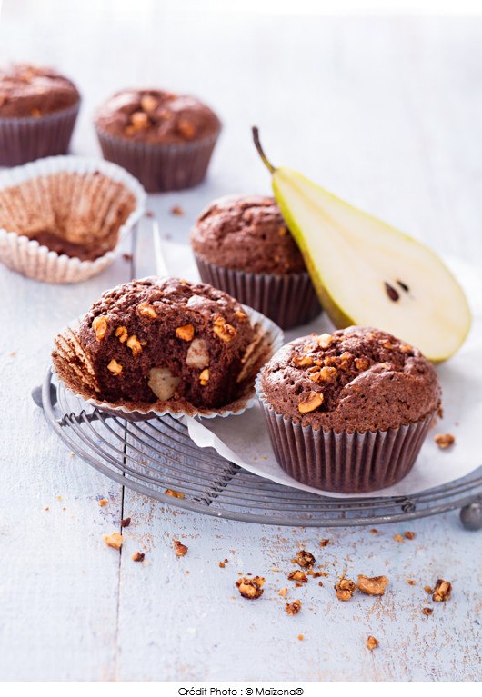Muffins chocolat aux poires pochées et noisettes caramélisées