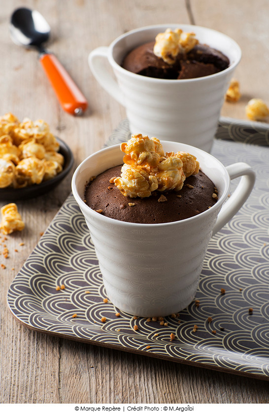 Laisser tiédir, ajouter quelques pop-corn caramélisés sur les Mugs Cakes et déguster !