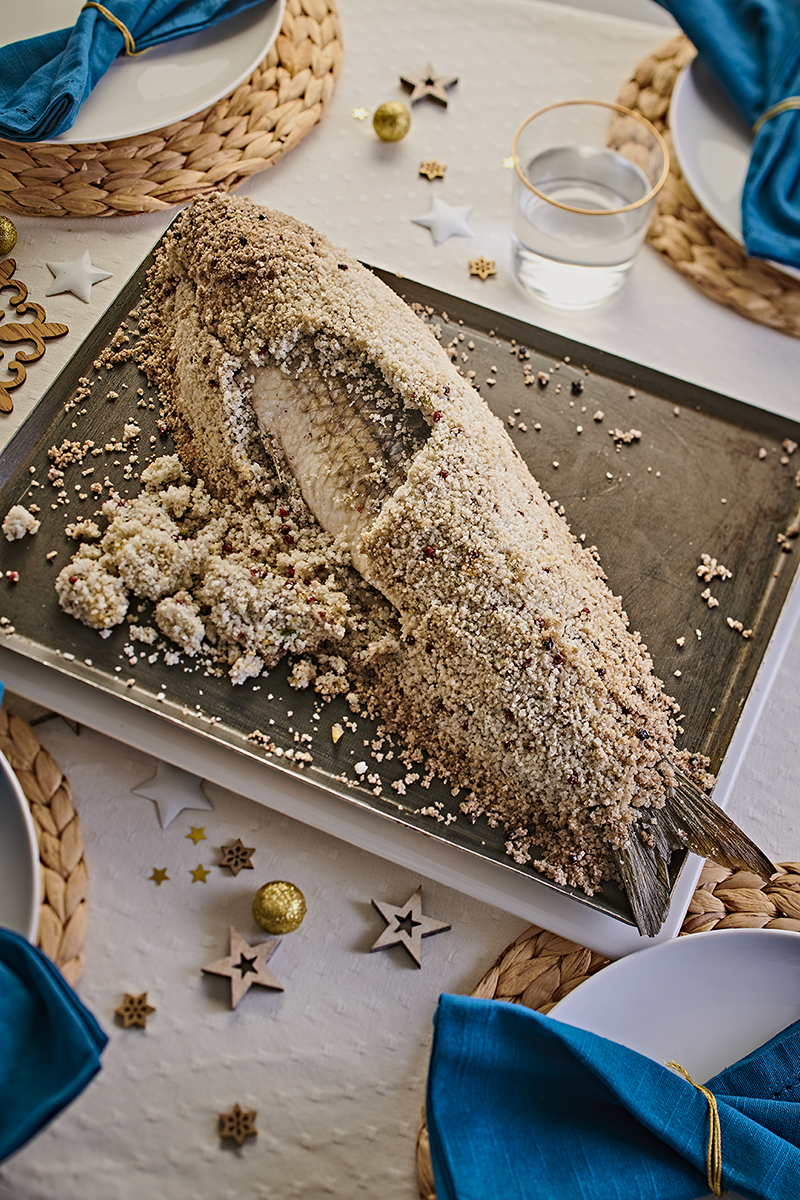 Pour les amateurs de saveurs traditionnelles revisitées, le mulet en croûte de sel aux herbes fraîches et aux baies roses est une véritable célébration de l’authenticité des fêtes de fin d’année.