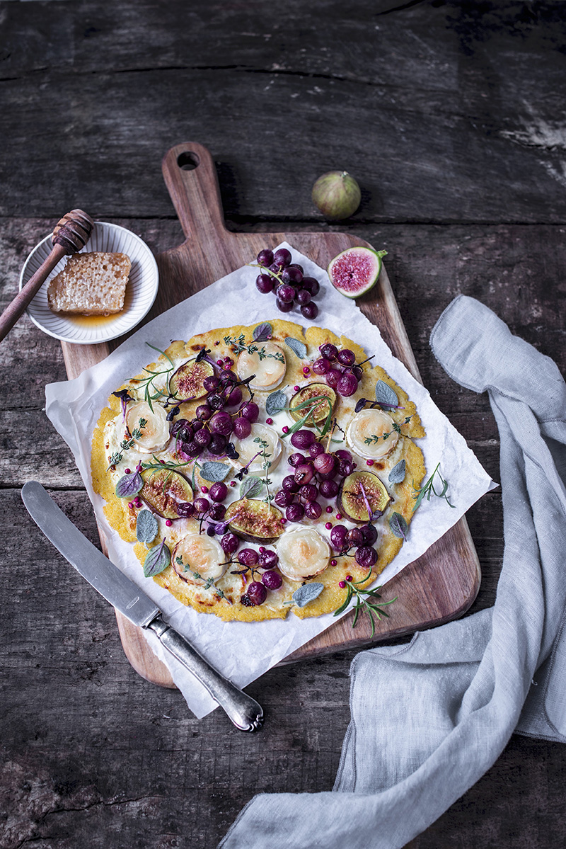 ④• Disposez les figues et le fromage sur la pâte. Ajoutez les raisins et les herbes. Arrosez d'un filet de miel. Enfournez et faites cuire 10 à 15 minutes.