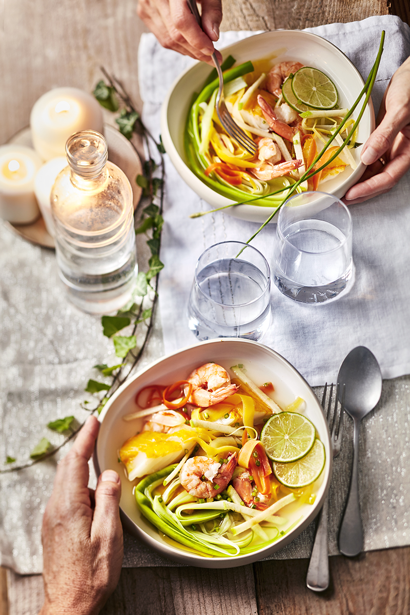 Nage de gambas et haddock, poireaux, piment, citronnelle, pomme Granny