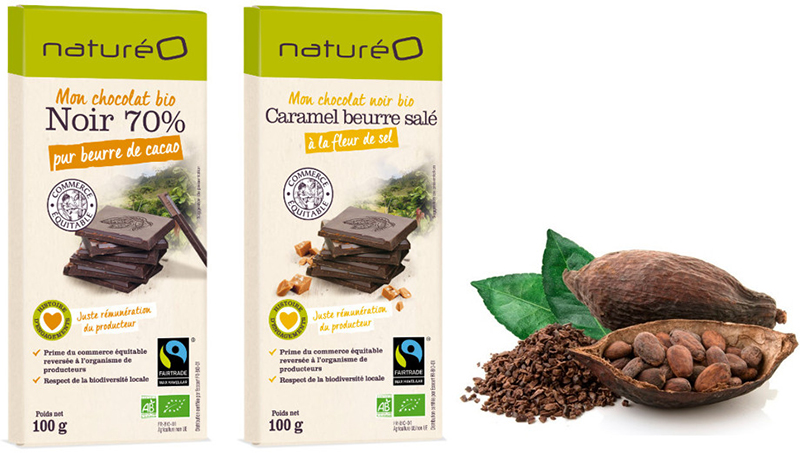 Pour ravir les becs sucrés et les fins connaisseurs, naturéO s’est associée à la Chocolaterie Castelain pour fabriquer des chocolats de dégustation et de cuisine au goût intense. Entreprise artisanale implantée depuis 1994 dans le Vaucluse, elle réalise, pour naturéO, des recettes équitables haut de gamme. Ces chocolats 100% bio sont pur beurre de cacao, garantis sans huile de palme ni lécithine de soja et les ingrédients qui les composent sont issus du commerce équitable.