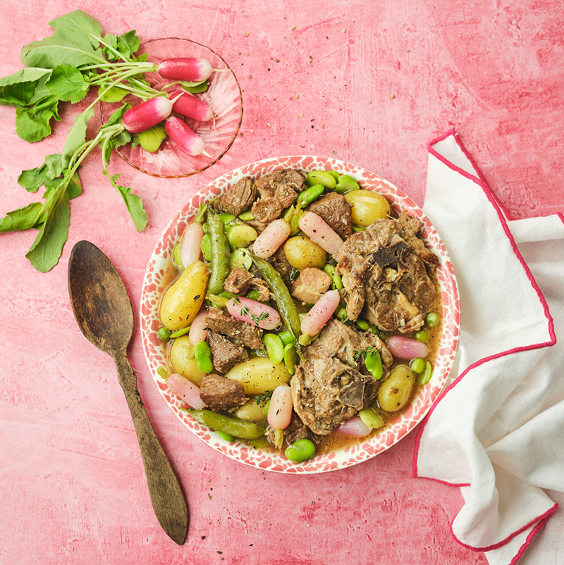Un grand classique réinventé pour la saison printanière avec des pois gourmands, des fèves et des radis roses pour une dégustation savoureuse.
