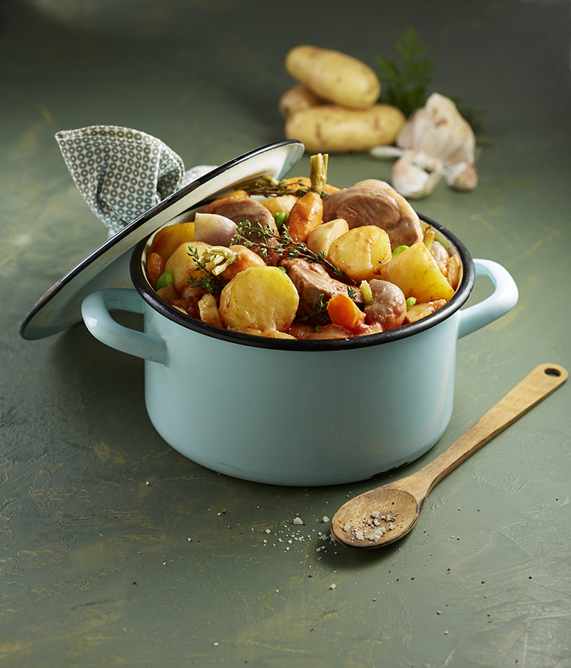 ①• DÉCOUPEZ l’épaule en morceaux réguliers, salez et poivrez et faites revenir la viande dans une cocotte avec l’huile d’olive. Quand les morceaux sont bien colorés, ajoutez les oignons coupés en lamelles.