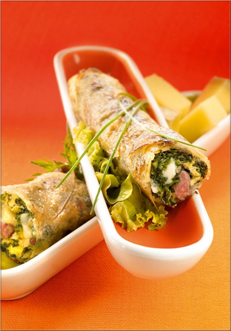 4• Découper le Beaufort en petits morceaux et mélanger hors du feu aux œufs brouillés. Ajouter les épinards aux lardons et mélanger à nouveau.