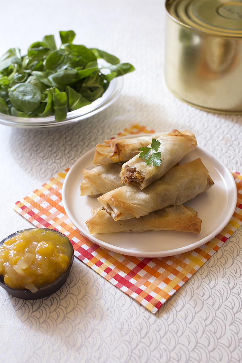 – Coupez une feuille de brick en quatre. Placez un quart de feuille devant vous la pointe du triangle vers le haut, l’arrondi vers vous et badigeonnez de graisse de canard fondue avec un pinceau.