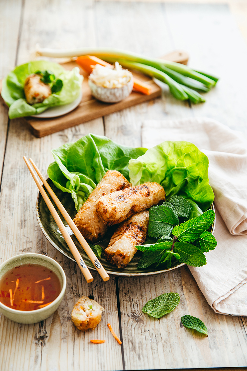 Servir avec la salade, les feuilles de menthe et la sauce nem.