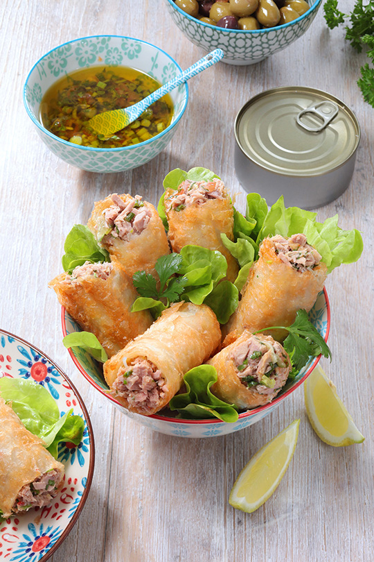 Servir aussitôt les nems avec de belles feuilles de salade, de la coriandre fraîche et la sauce Chermoula.