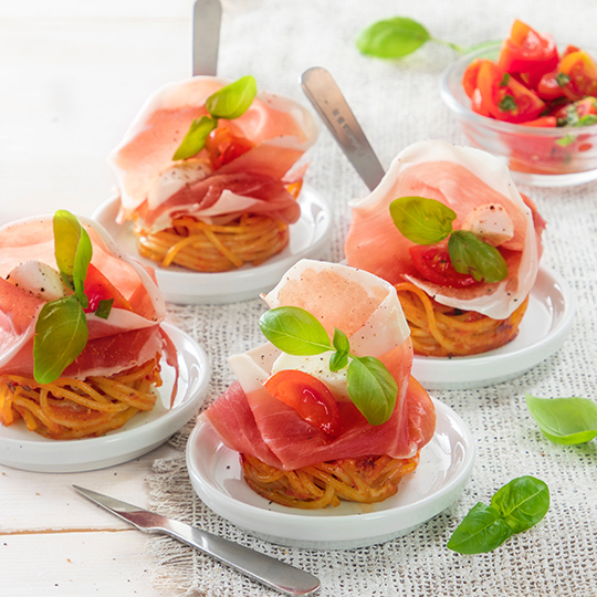 Nids de spaghettis frits, mozzarella et jambon de Parme