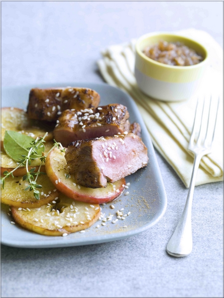Servir les tranches d’agneau sur un lit de pommes, saupoudrées de sésame et accompagnées de confiture d’oignon.
