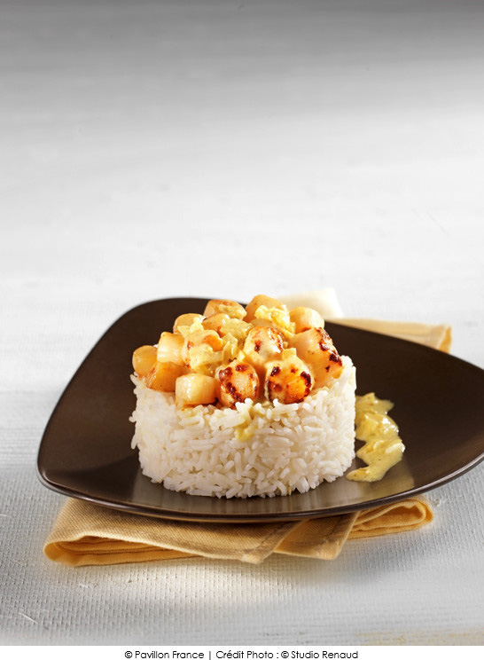 ⑥• À l’aide d’un cercle de cuisine, dresser le riz en assiette, compléter de pétoncles, retirer le cercle et napper de sauce.