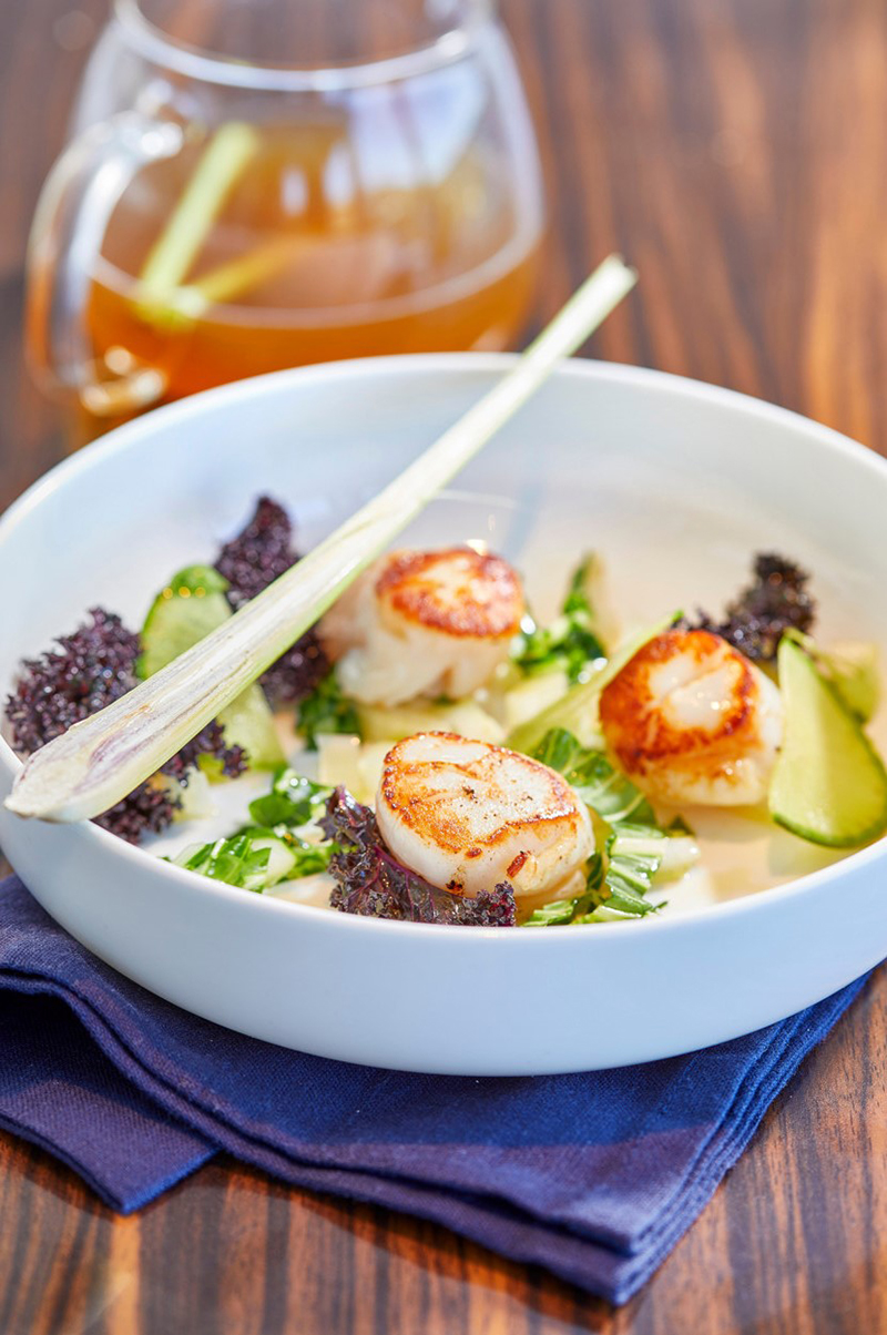 Noix de Saint-Jacques au poivre verveine, choux bok choy et kale, jus de crevettes grises à la citronnelle